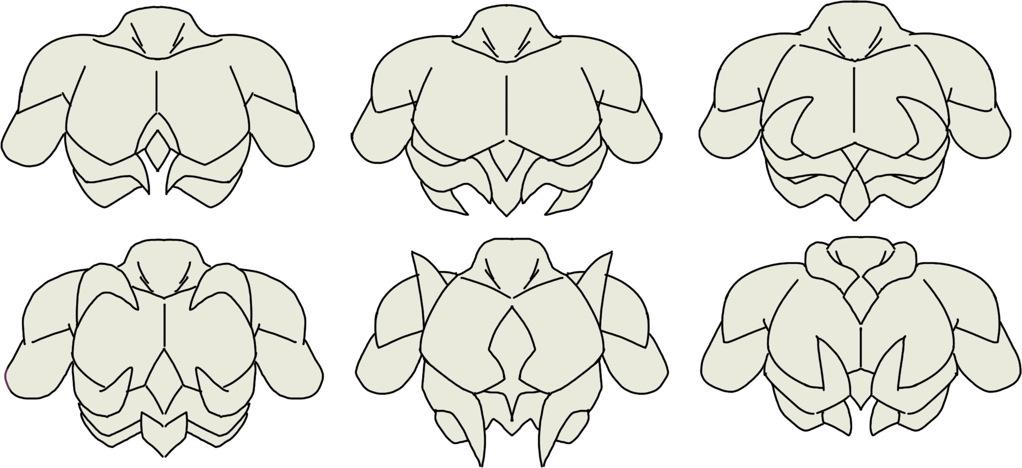 El diseño de esta osamenta puede variar, por lo general está más desarrollada en las clases peligrosas ya que es un reforzamiento natural que protege sus órganos vitales al momento del combate.En hembras el diseño de esta osamenta puede llegar a ser más ornamental.